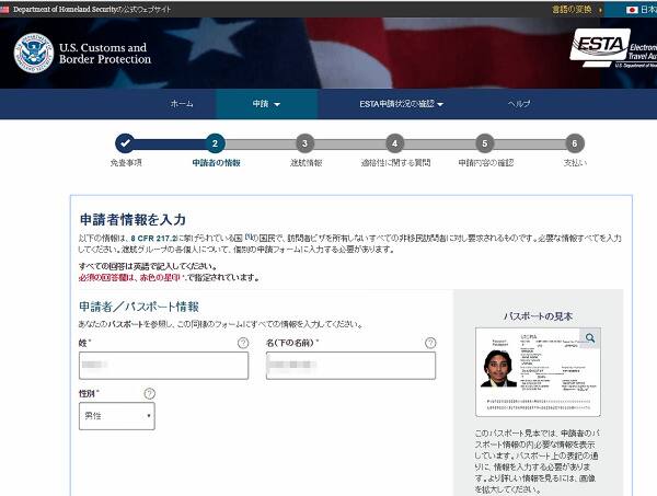 英語での「Home | Official ESTA Application Website, U.S. Customs and Border 」というサイトからですと英語表示となっていますので、サイト右上にある言語を日本語を選べば日本語でのESTA申請のサイトとなります。