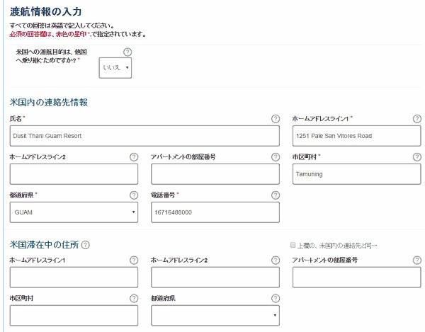 私の場合はグアム旅行でのESTA申請ですからグアムでの滞在先を入力します。