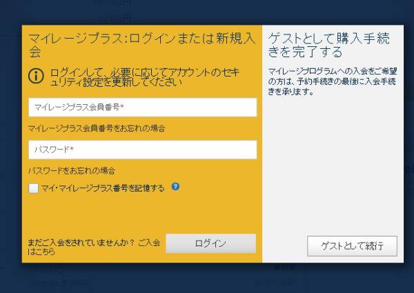 そうしますとマイレージ会員かどうか聞いてきますので、会員の方はログインして購入します。