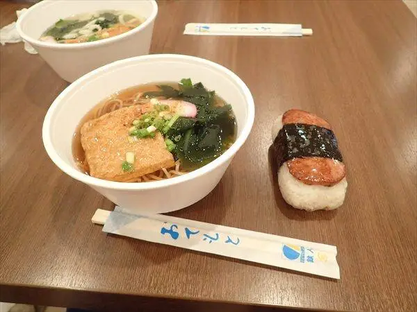 そこで今回はうどんとそばとスパムむすびを頂きました。