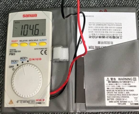 日本の我が家でコンセントの電圧を測ってみますと104.6ボルトでした。