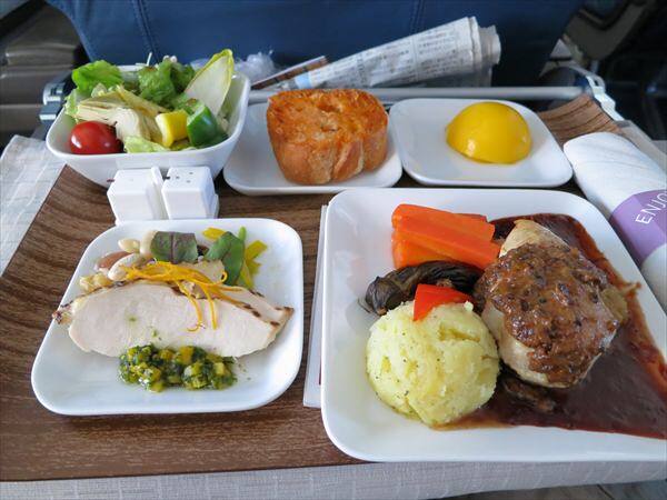 ビジネスクラスの機内食は短距離便ですからお盆にチキンやビーフなどのメインとサラダ、パン、デザートがのせられて運ばれてきます。