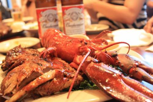 ビーフリブアイ226g、タイガーシュリンプ、ロブスターテール、マヒマヒ113g、マリネチキン170g、イカリング85g、ナス、ピーマン、コブコーン