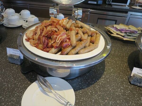 ホットミールはソーセージやカリカリに焼いたベーコン、ポテト、ポークなどが並んでいました。