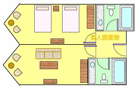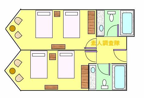 通常のツインルームはこのファミリールームの半分のような部屋のレイアウトとなっていて、広さは28㎡となっています。
