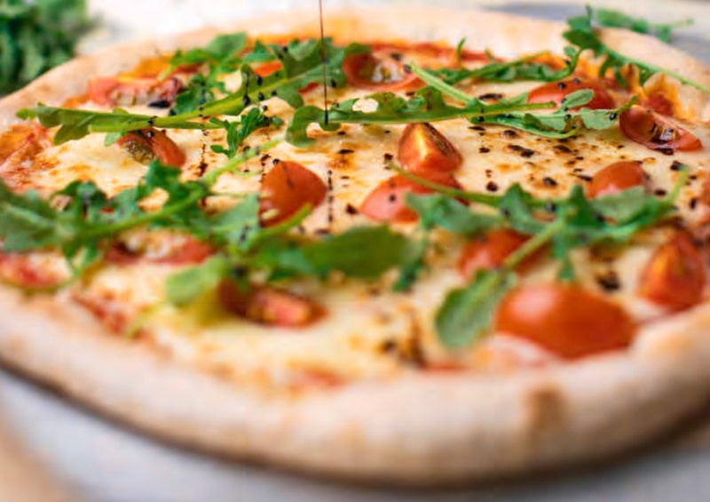 グアム産ルッコラ、パルメザンチーズ、トマトソース、チェリートマト、モッツアレラチーズ、バルサミコ酢