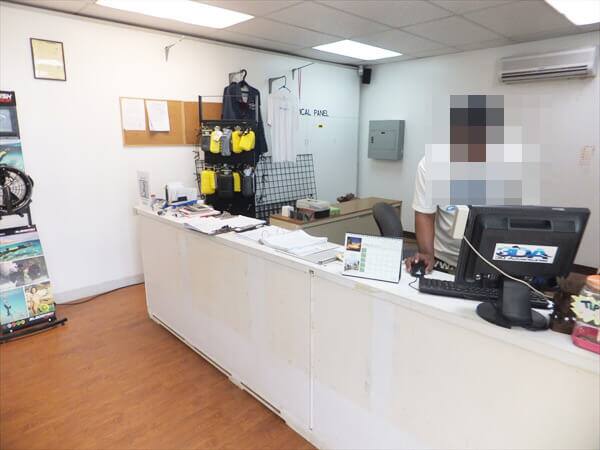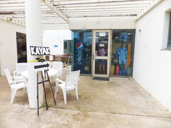 カヌーに乗るためにはまずウォータースライダーのあるプールの左側にあります階段をテニスコートの方に下りていきますとショップの建物がありますので、そこで申し込みをします。