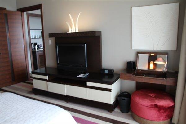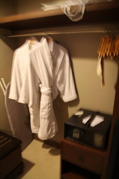 部屋のレイアウトは扉を開きますとリビングルームとなっていて手前にはクローゼットがあり、ここに無料の金庫も置かれていてバスローブもありました。