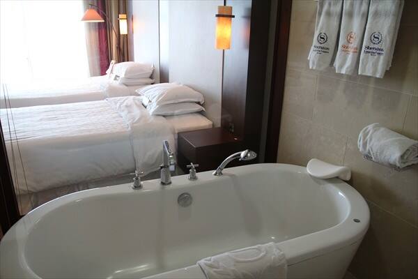 カップルには良いかもしれませんが、バスルームとベッドルームはガラスで仕切られていますので、ベッドからバスルームが丸見えで、家族旅行では困るかもしれません。