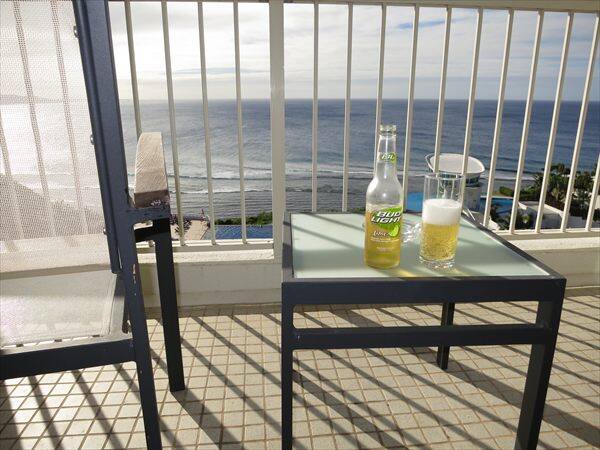 このベランダでは夕日を見ながら、グアムに来たら必ず飲むバドワイザーのライムを飲んでくつろぎました。