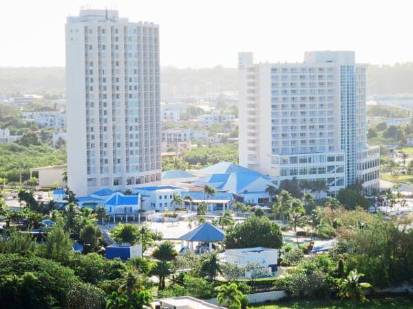 ビーチ側から見た星野リゾート リゾナーレグアムで右手の建物がウイング棟で左手の建物がタワー棟となっています。