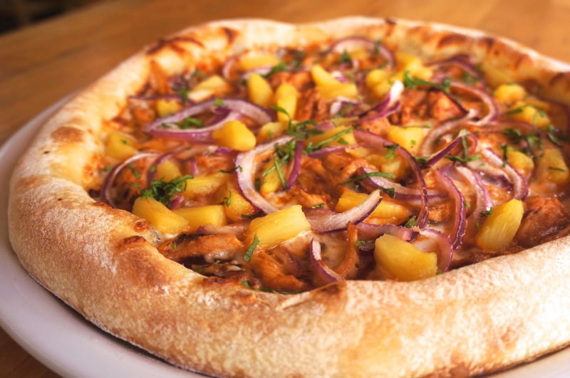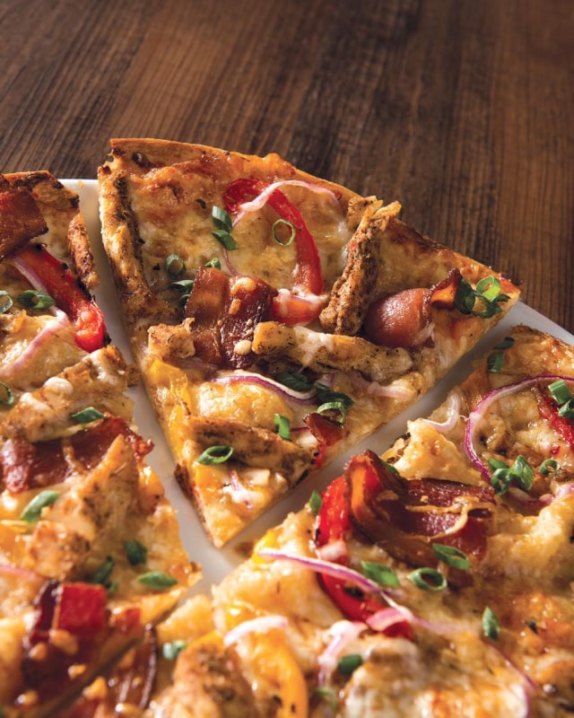バーベキューソース、アップルウッドスモークベーコン、スモークゴーダチーズとモッツァレラチーズ、プルBBQチキン、スライスしたレッドオニオン、フレッシュコリアンダー添え