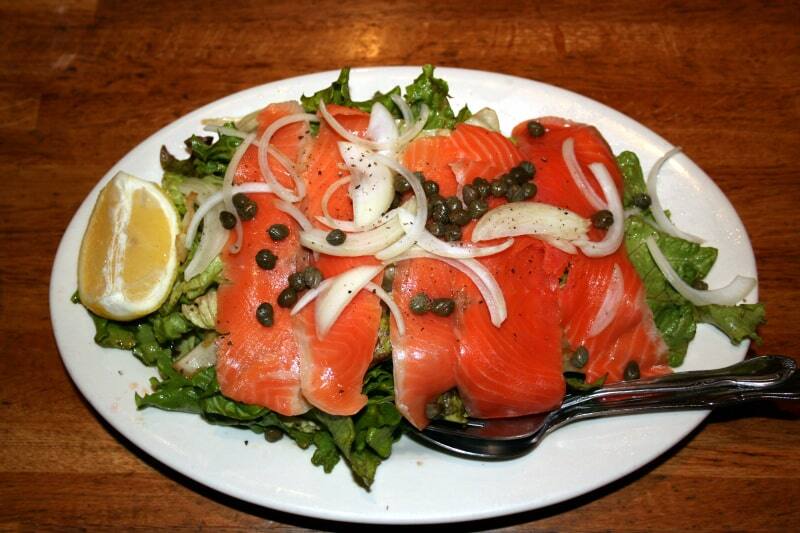 新鮮なミックス・グリーンをイタリアンドレッシングで和えたサラダにスモークサーモンを添え、スライスオニオンとケーパーをトッピング