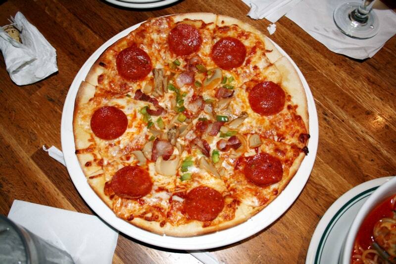 サラミ、ベーコン、ペパロニ、イタリアンソーセージをミックスしたピザ