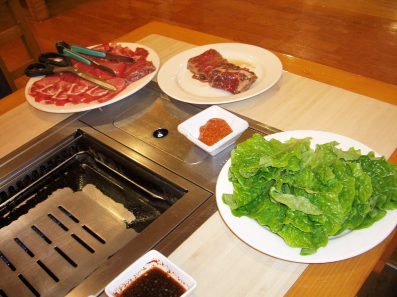 牛タン、豚の三枚肉、骨付きカルビ、ロース、ユッケ、サンチュ(フレッシュ野菜)、にんにく焼き、冷麺、石焼きビビンバ、キムチ・ナムルなど付出し(おかわり自由)
