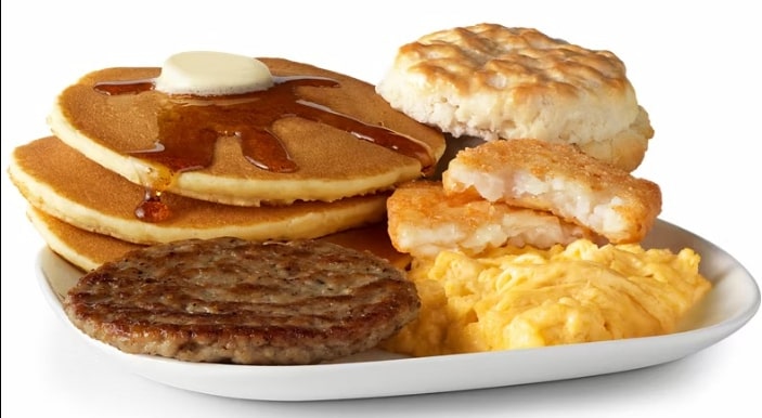 朝食はホットケーキ、ホットケーキシロップ、スクランブルエッグ、ビスケット、ハッシュブラウン、ソーセージパテのボリュームあるビッグブレクファストウィズホットケーキもお勧めです。