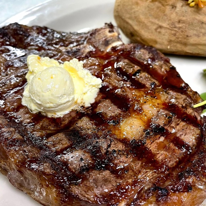 ケイジャンスパイスに漬け込んだ16オンスのリブロースをメスキートで焼き上げます