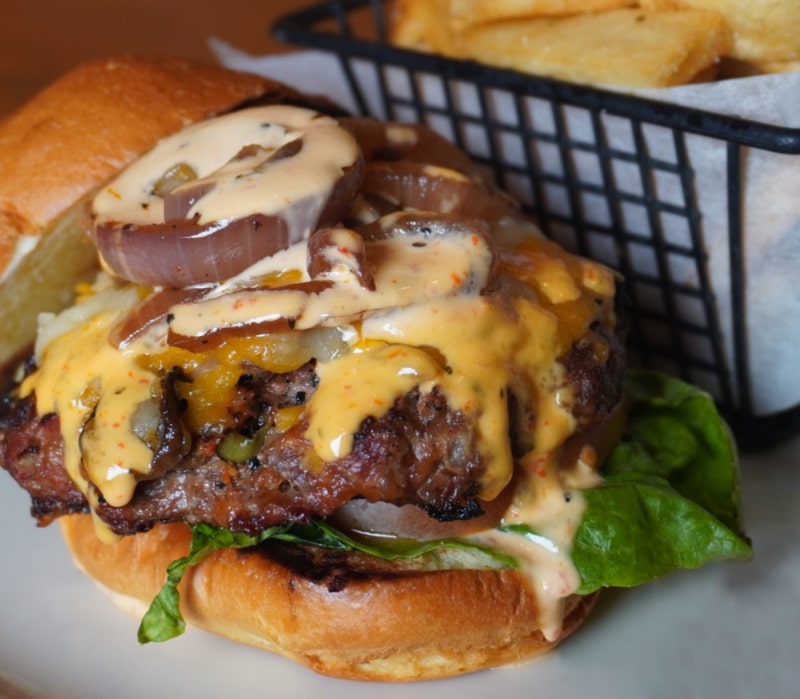 ワイルドファイアーマッシュルーム、オニオン、ミックスチーズをUSDAチョイスビーフパティに挟み、ダイスオニオンとダイナンシュで手作り