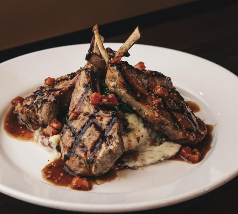 好評により復活しました、当店の子羊肉は直火焼です、ローストトマトのガーリックハーブソース、クリーミーなガーリックマッシュポテト、ほうれん草を添えて