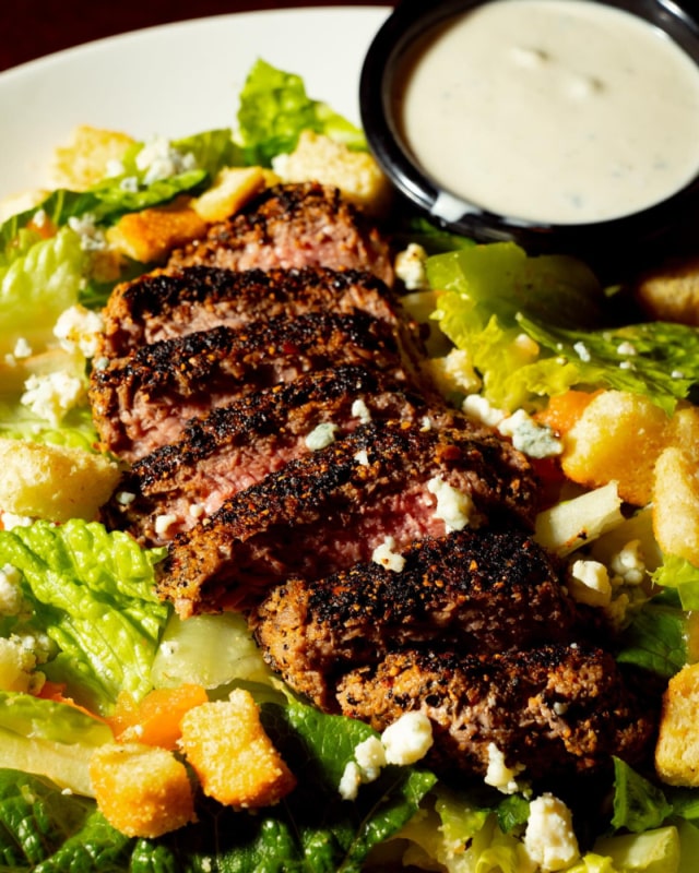 グリルした7ペッパーサーロイン、角切りトマト、クルトン、砕いたブルーチーズ