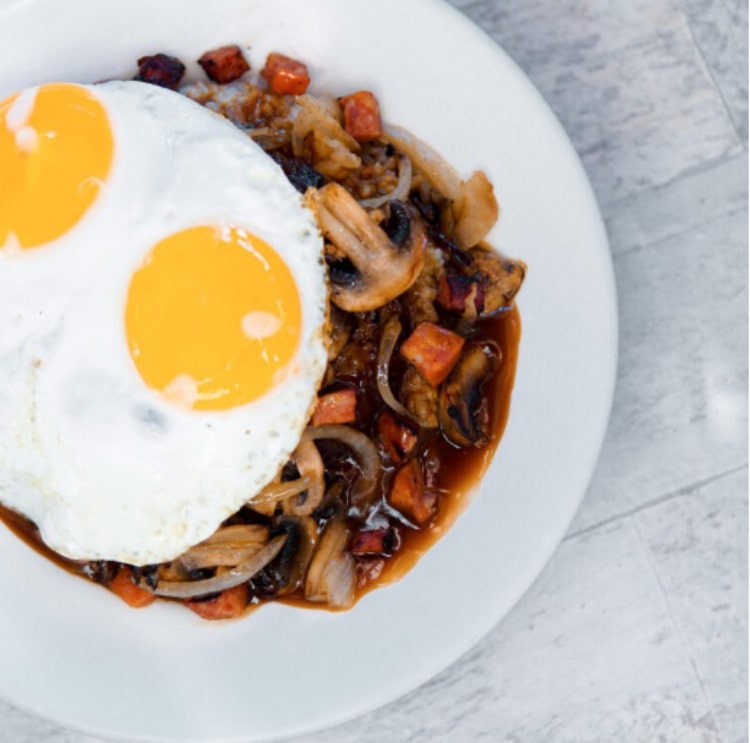 グアムの朝食にはぴったりのエッグベネディクトなど卵を使った料理メニューがあるのですが、おすすめは目玉焼きとチャモロソーセージ、フライドライスのタモンビストロです。