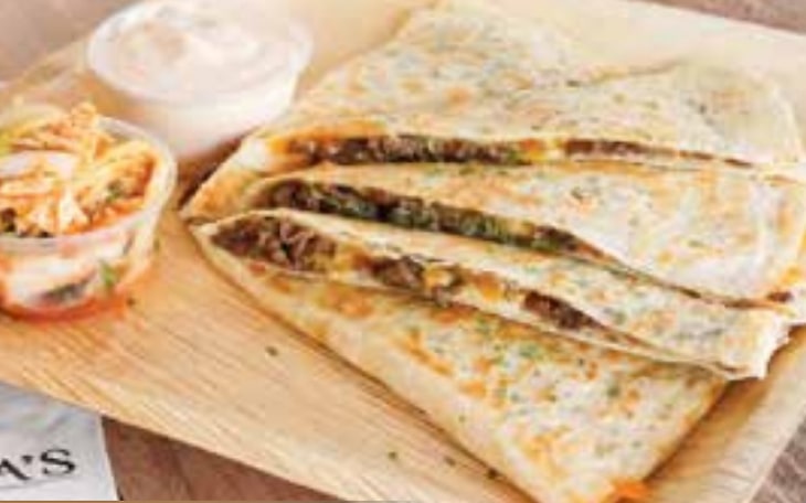 プルコギにモッツァレラチーズとチェダーチーズを合わせ、ごちそうフレークをまぶしたものを小麦粉のトルティーヤで挟んだもの