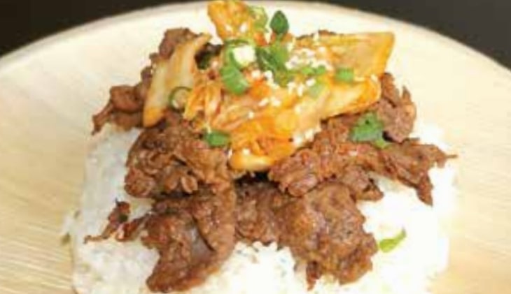 プルコギのマリネをご飯にかけ、キムチ、ネギ、ゴマをトッピング
